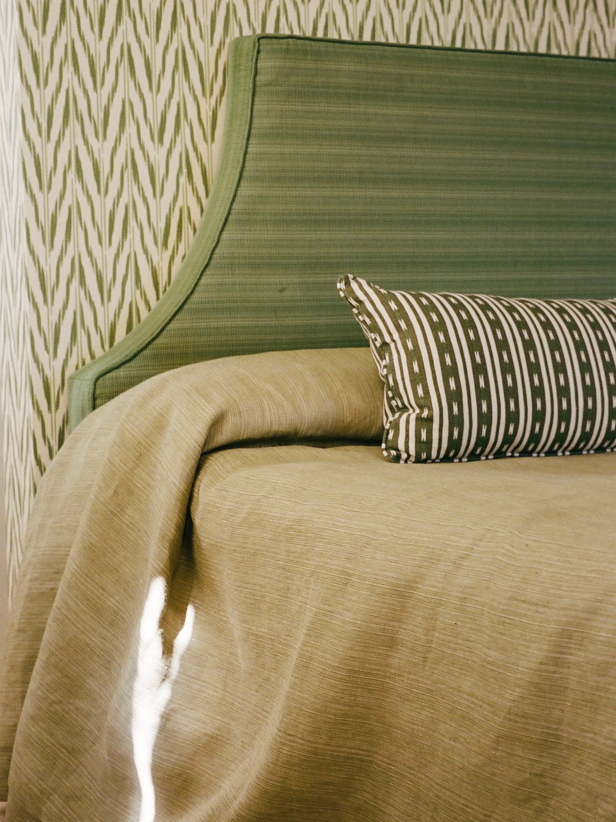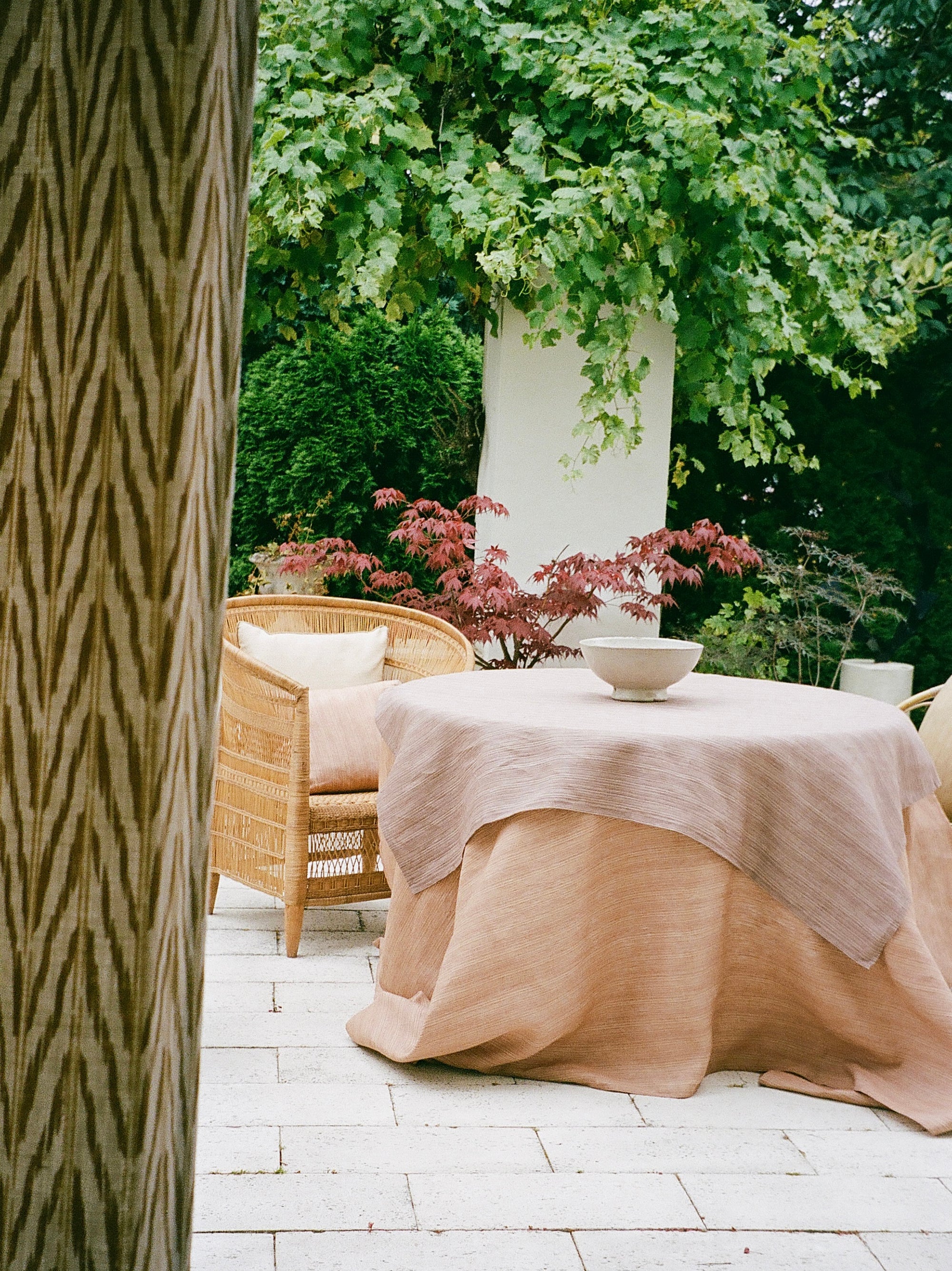 Today, we bring this artistry forward with a modern sensibility: two carefully balanced tones of linen yarn are woven together to create a textile that appears as a serene plain from afar, yet reveals subtle depth and movement on closer inspection.