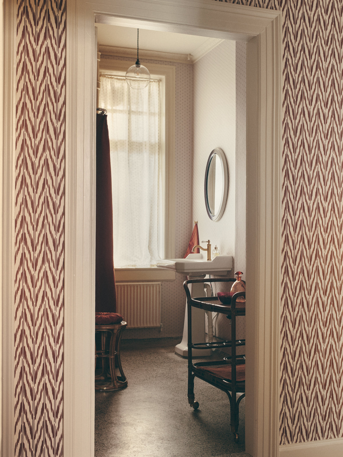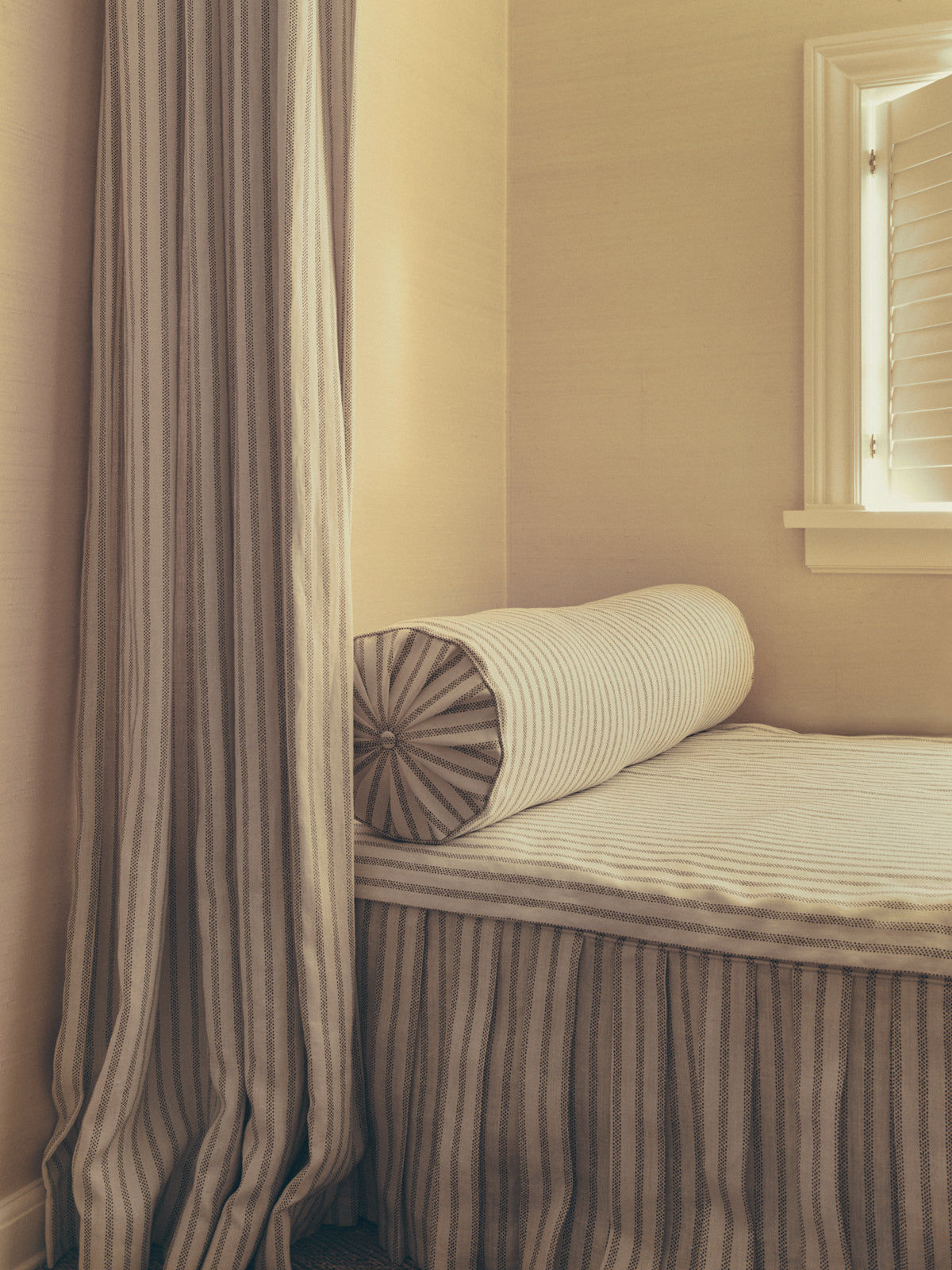 Bedding, headboard and large cushions in Eivor's Stripe Fabric, Rust