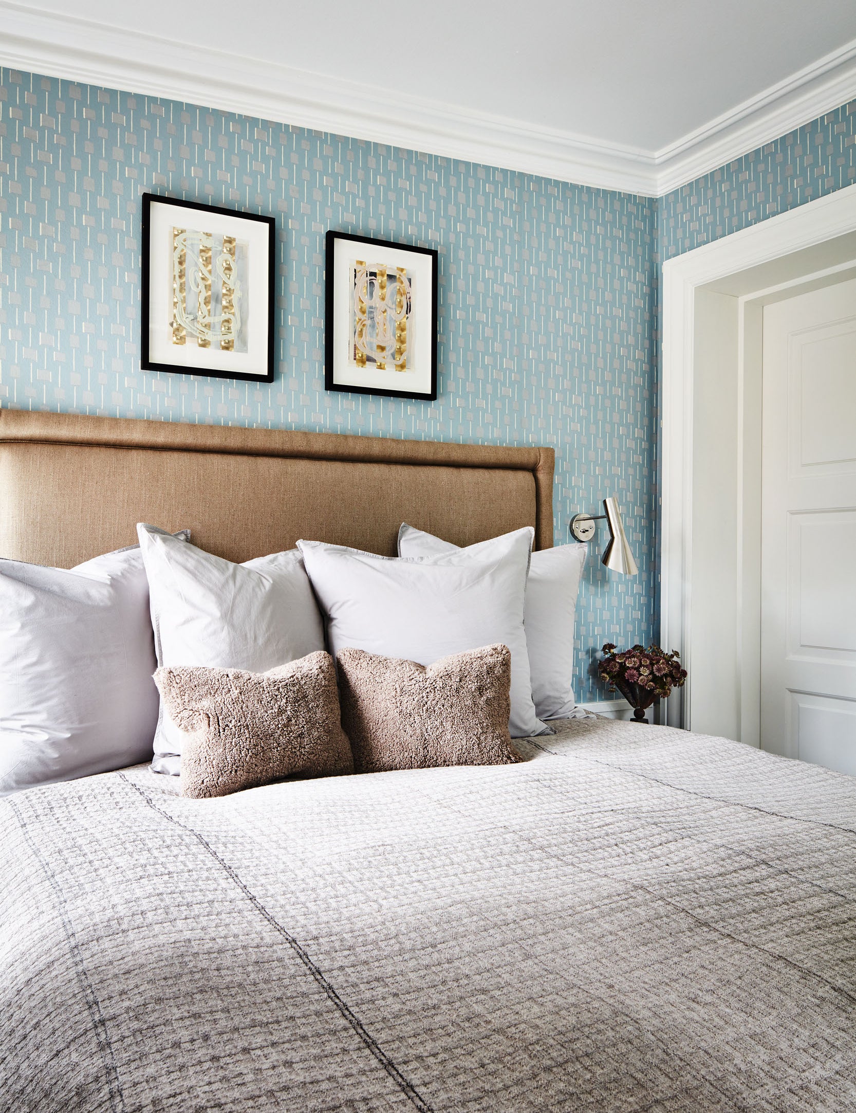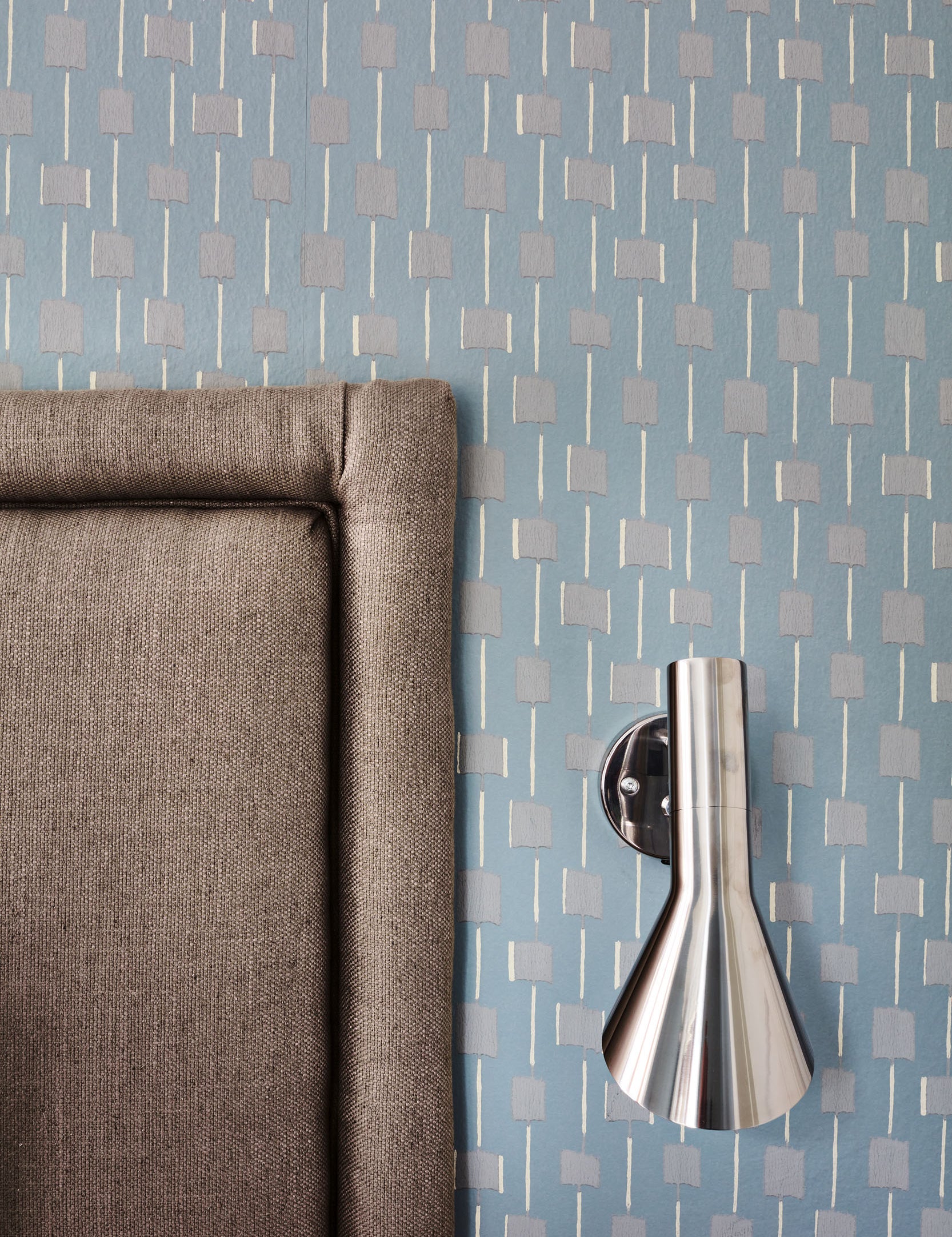 Hand-painted in a geometric composition of soft curves and a changeable cadence—reminiscent of an impeccably composed piece of jazz—Townhouse wallpaper in Champagne and Blue Smoke enriches the setting with a refined, contemporary allure.