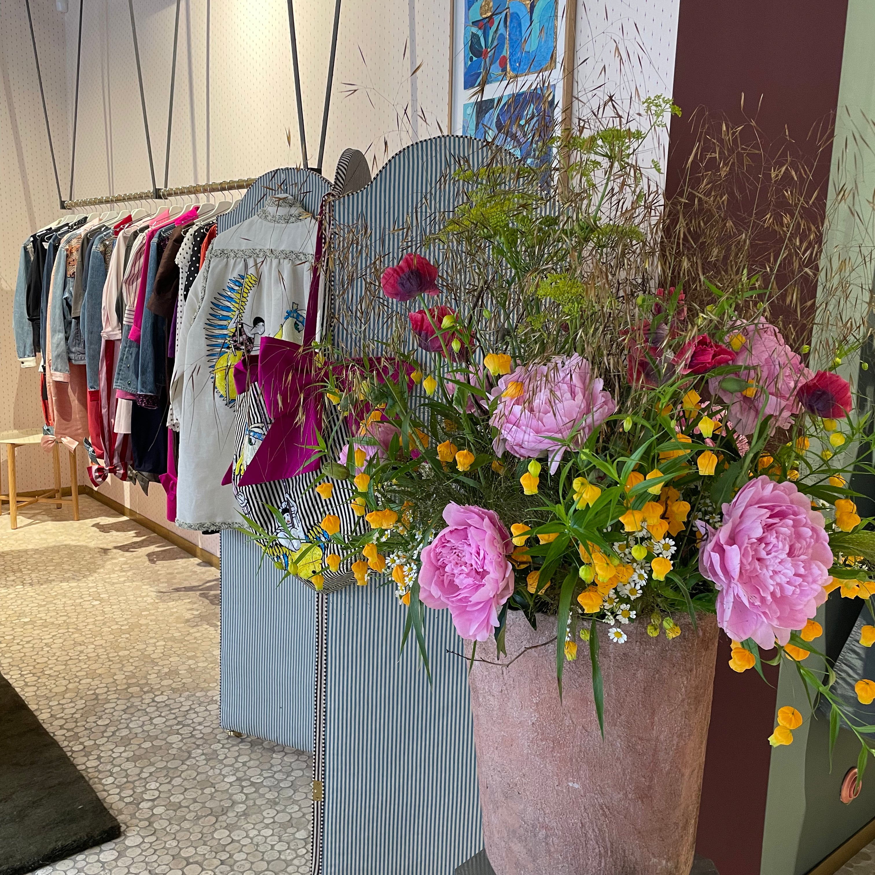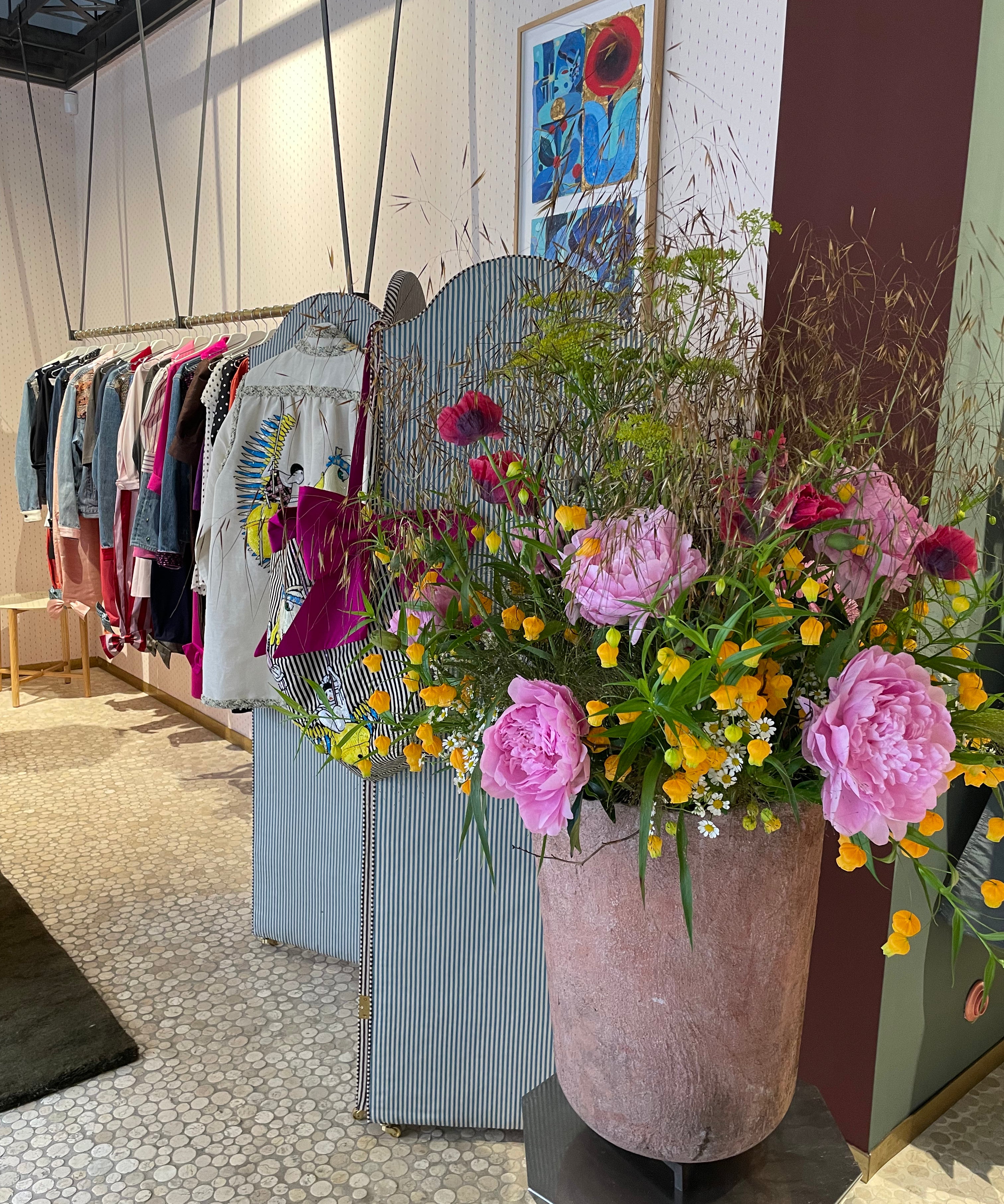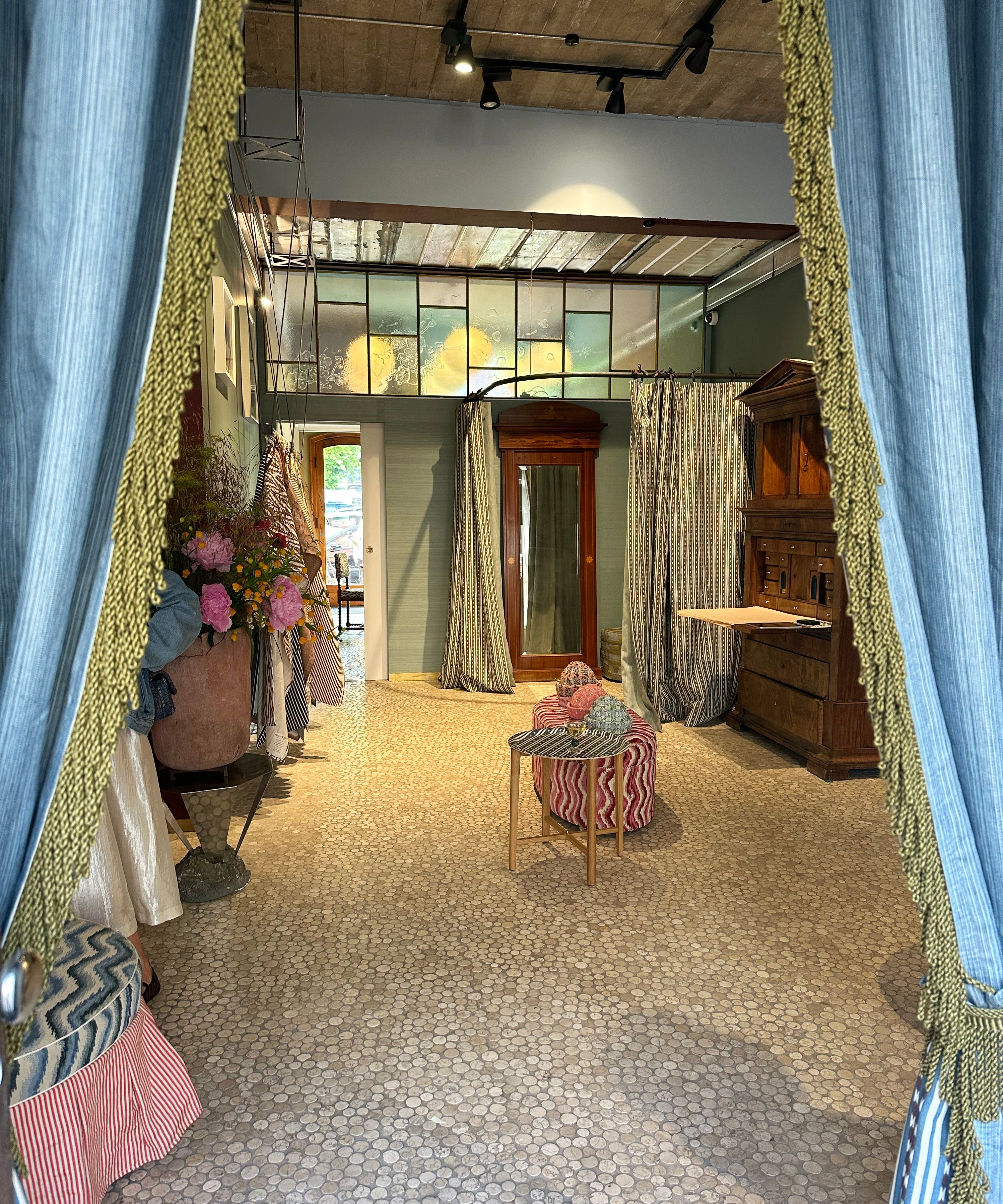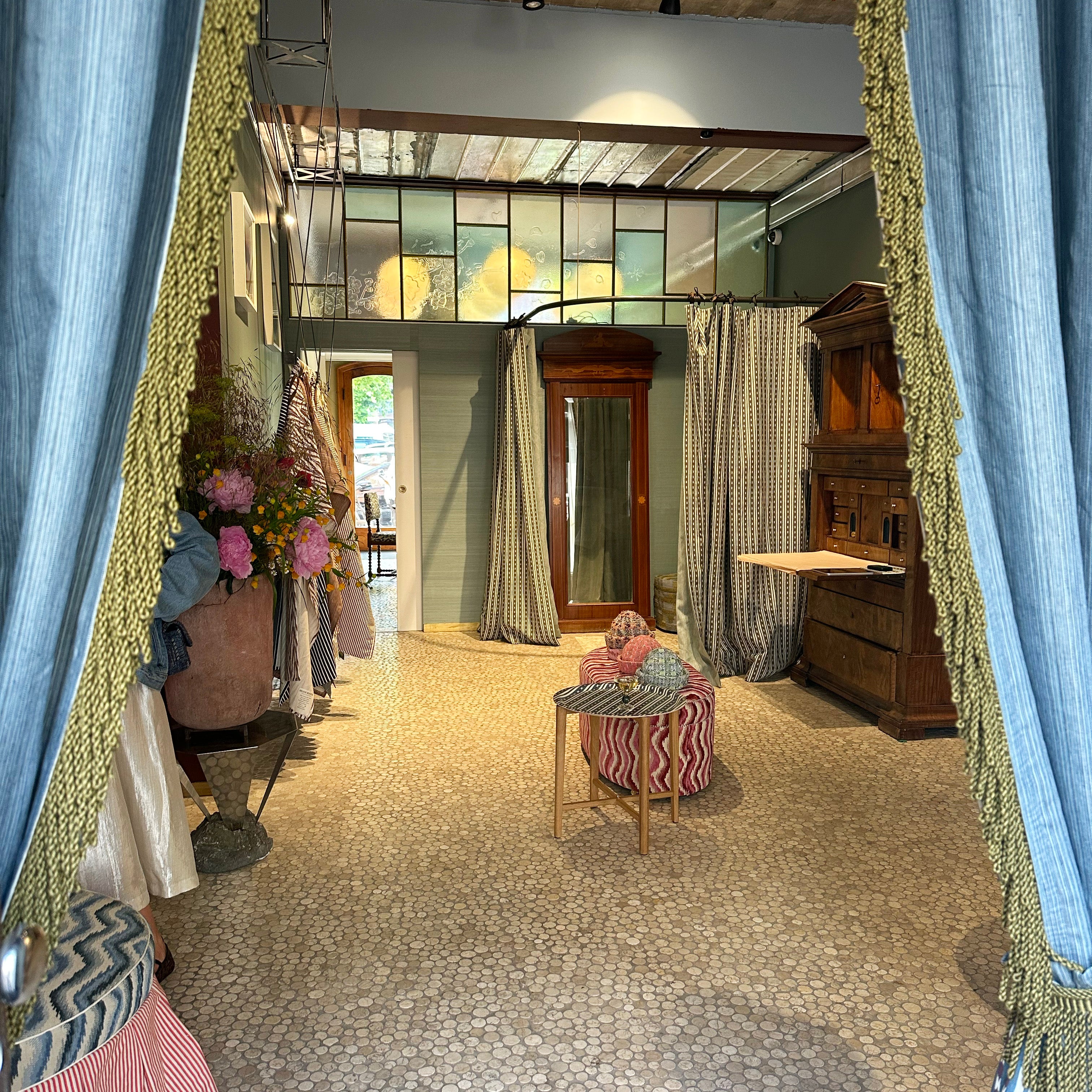 To celebrate the collaboration, Jannik, owner of Tapet-Cafe and Interior Decorator, has transformed the Caro Editions store. The objective was to create a positive, fresh, and lively atmosphere to showcase the clothes, using Helene’s fabric and wallpaper designs alongside small, occasional furniture pieces dressed for the occasion with layers of fabrics, pleats, and trims.
