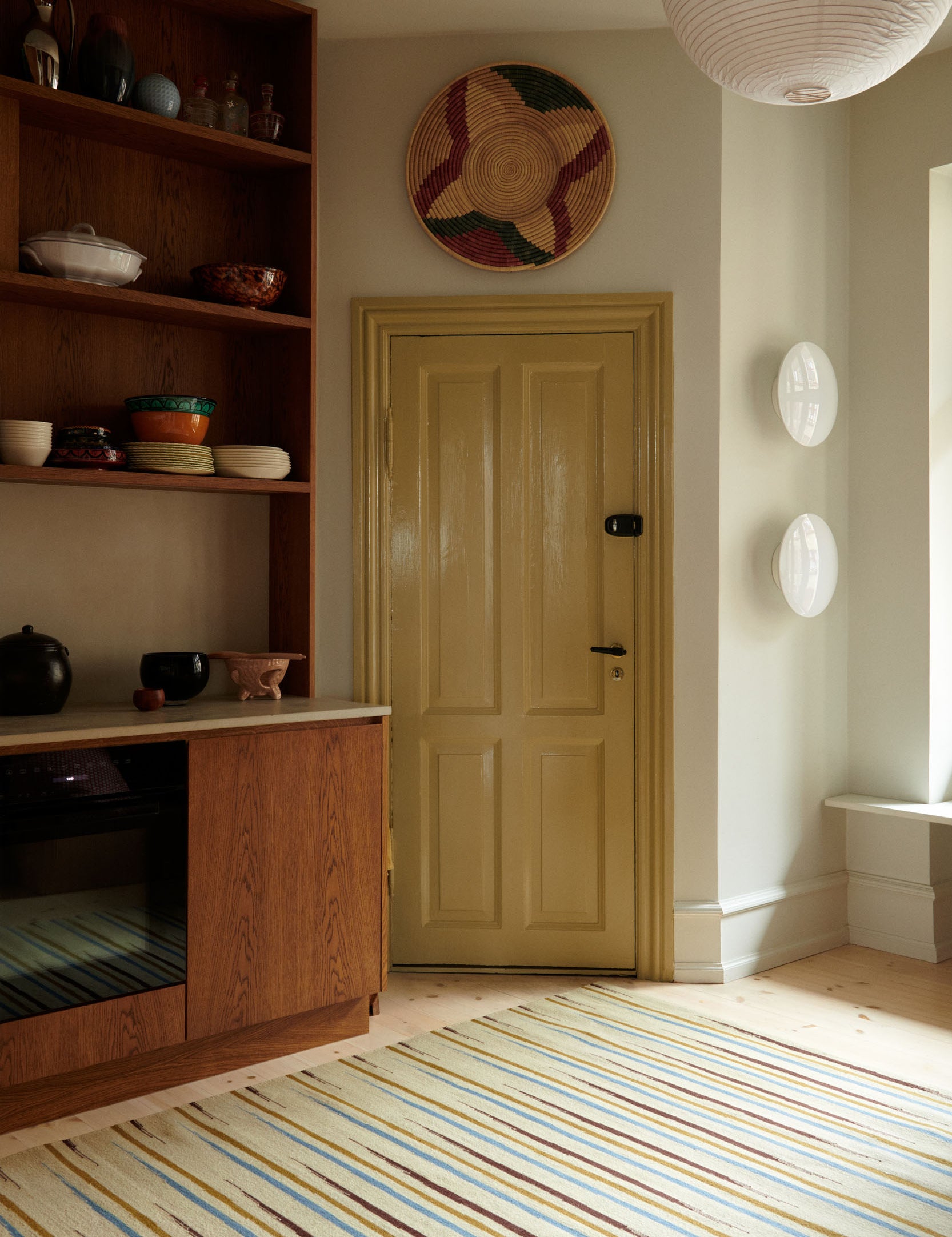 The rugs, designed by Helene Blanche for Linie Design, add to this atmosphere, grounding each room with their quiet tactility and subtle hues. Their handwoven quality and earthy tones echo the past—recalling traditional crafts and time-worn textiles—while still feeling entirely modern in expression.