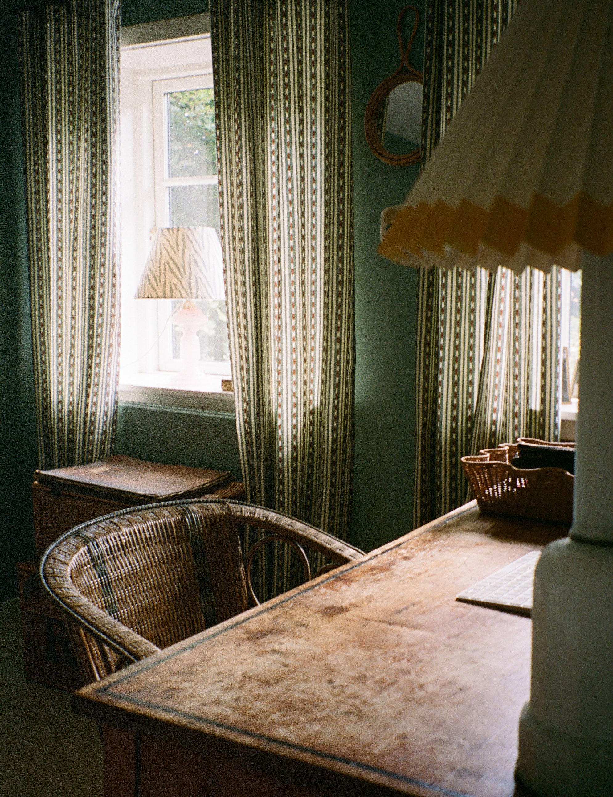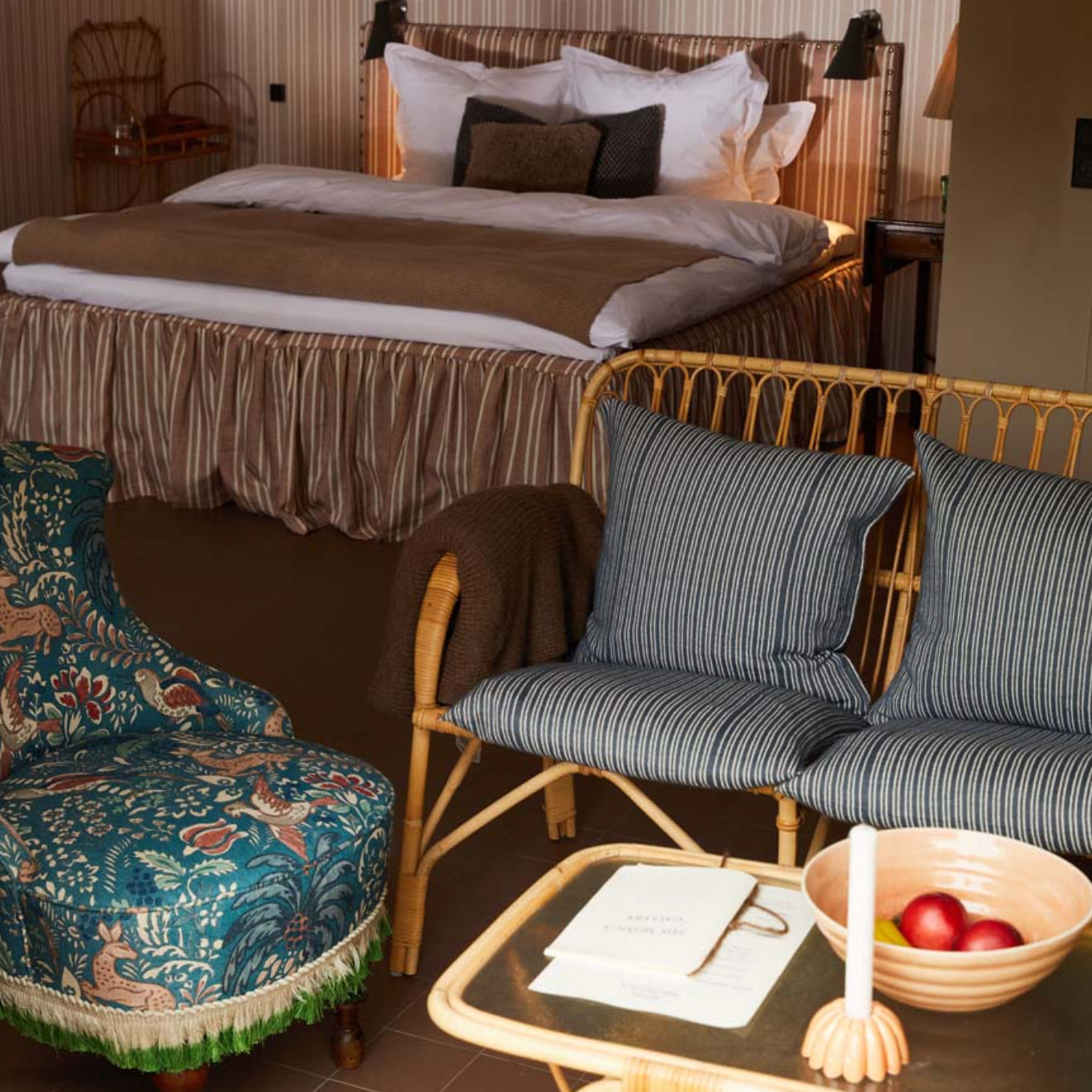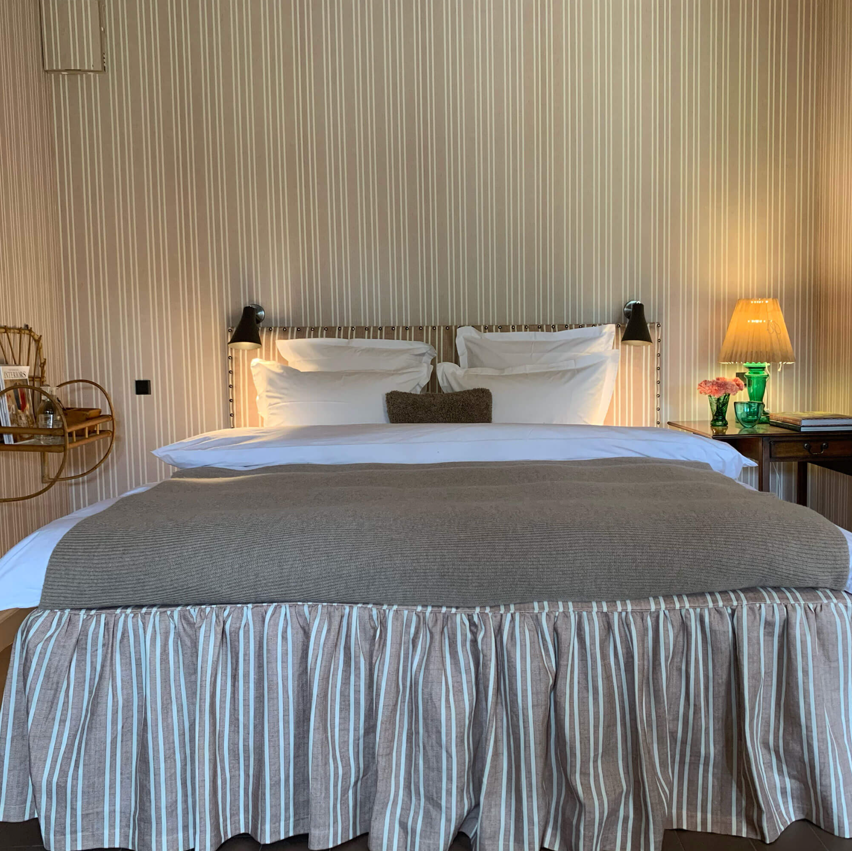 "Monica has an extraordinary eye for layering hues and motifs in a way that feels both effortless and playful. Each room tells its own story, adorned with our textiles and wallpapers—Drop, Painted Stripe, Marquise, Polka Stripe, and Needlepoint Stripe—woven seamlessly into the hotel’s unique identity." Helene Blanche