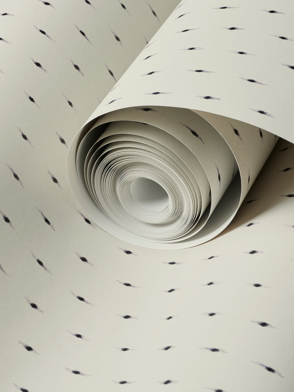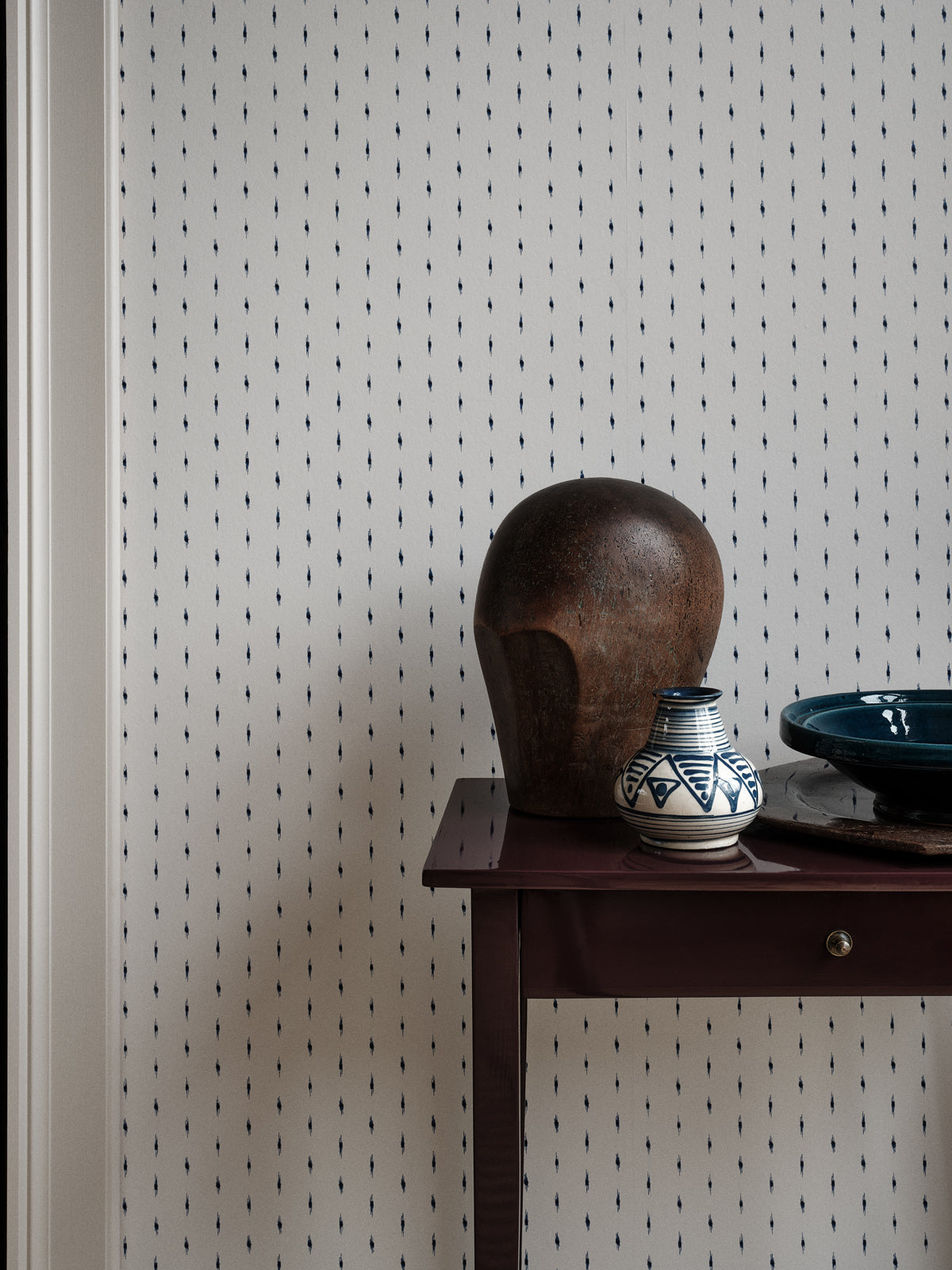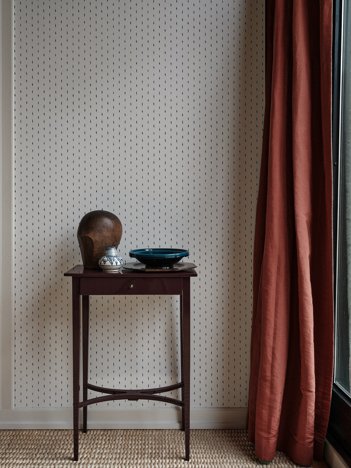 Drop wallpaper has a timeless and poetic expression that adds elegance to the space. The printed patterns is embellished with small dots, brought to life from a hand-painted drawing of tiny hand-painted drops of ink meeting a silk surface.