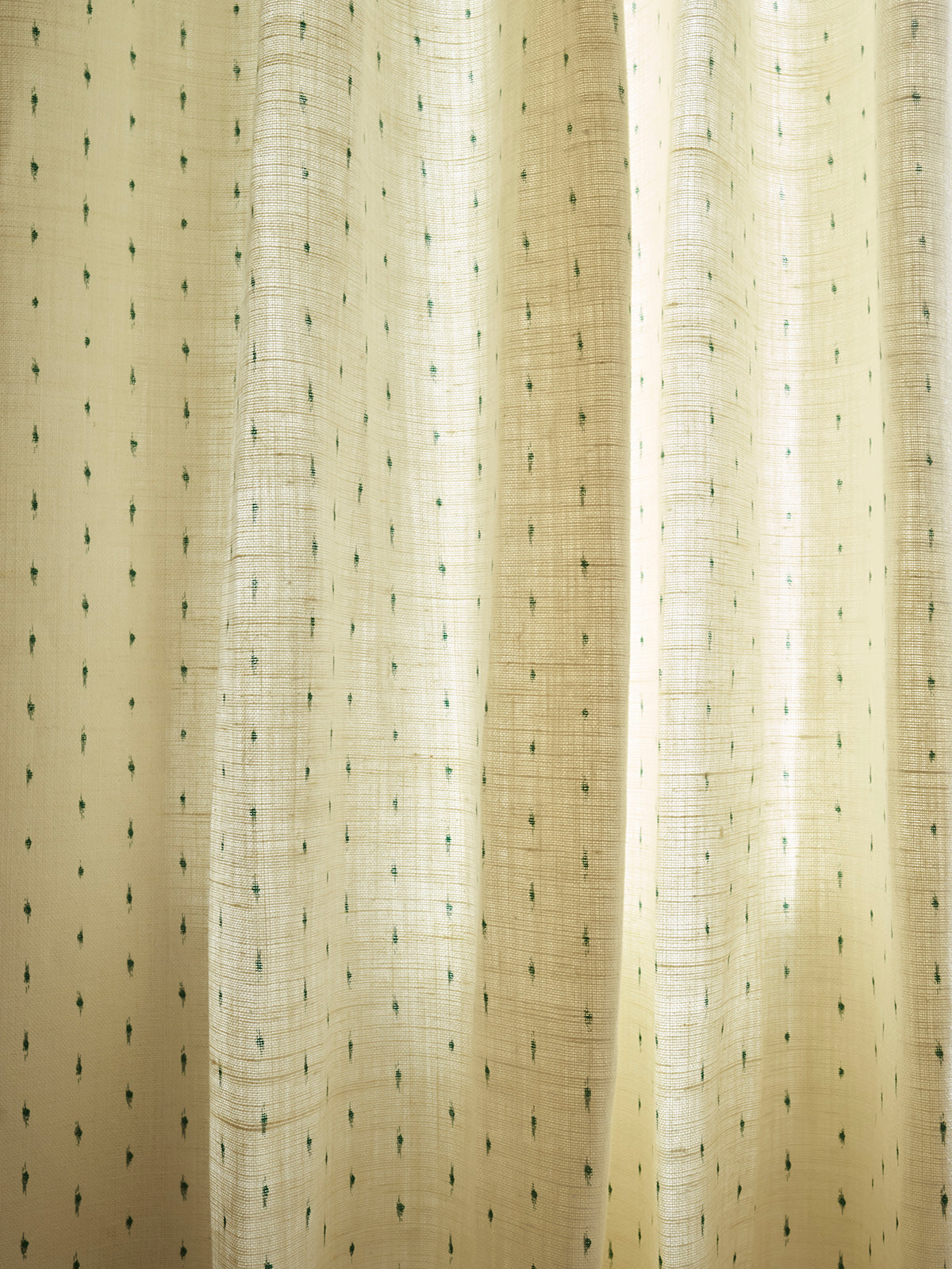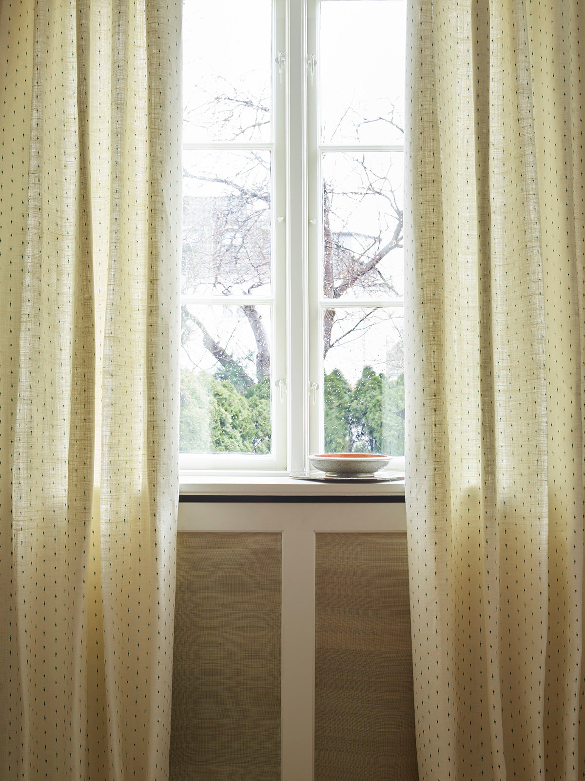Drop fabric has a timeless and poetic expression that adds elegance and classiness to the space. The fabric is embellished with small dots, brought to life from a hand-painted drawing of tiny hand-painted drops of ink meeting a silk surface.