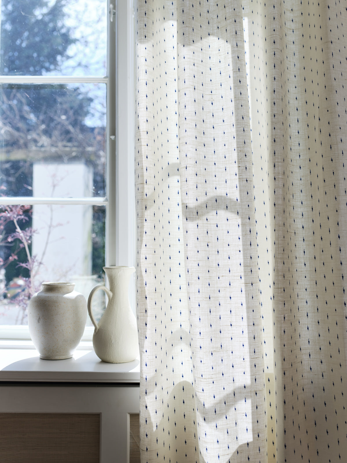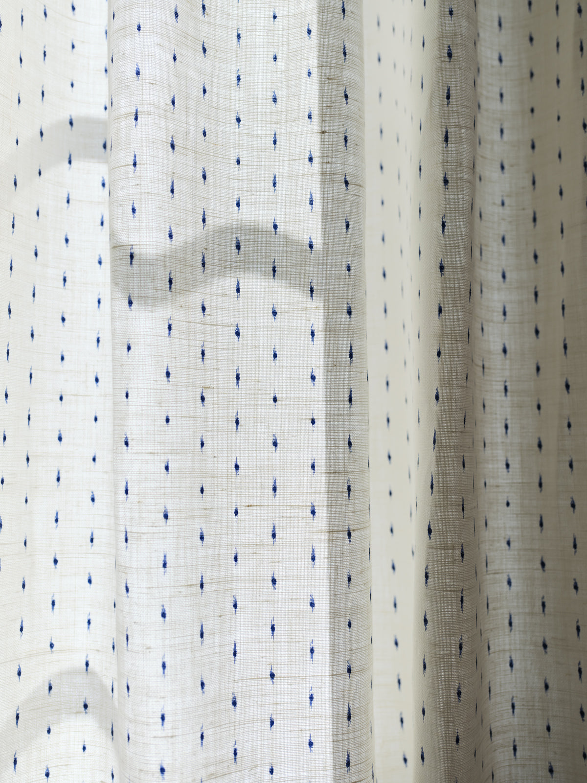 Drop fabric has a timeless and poetic expression that adds elegance and classiness to the space. The fabric is embellished with small dots, brought to life from a hand-painted drawing of tiny hand-painted drops of ink meeting a silk surface.