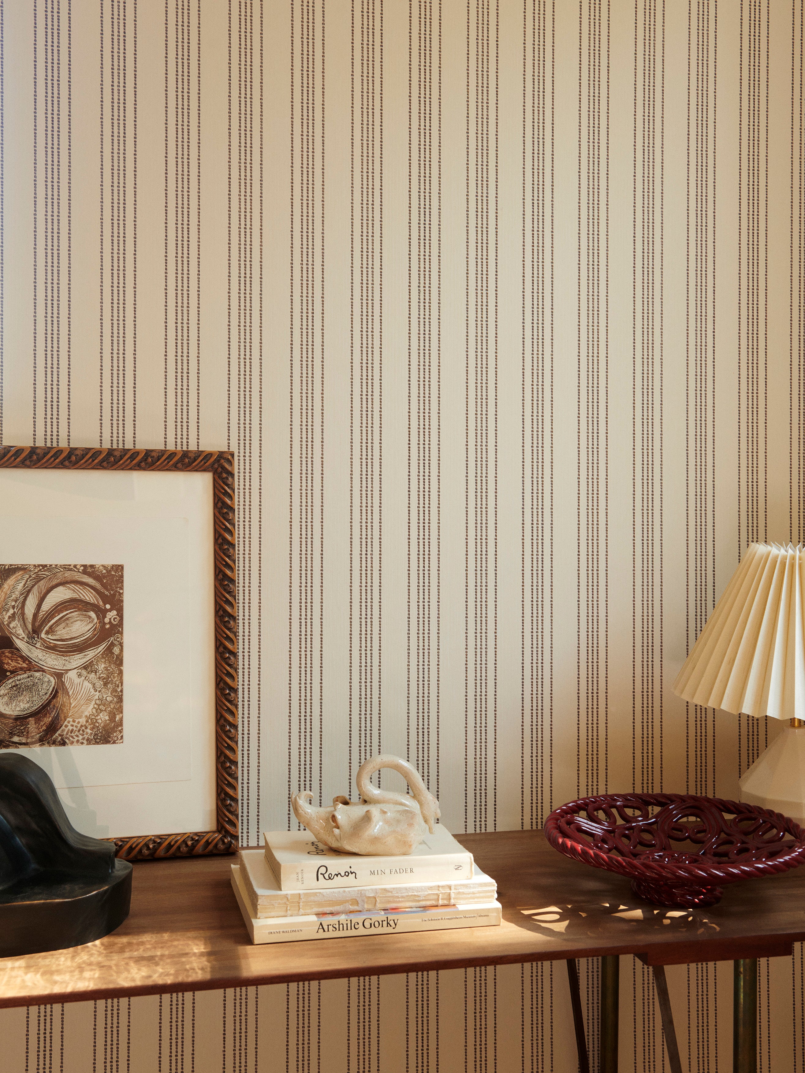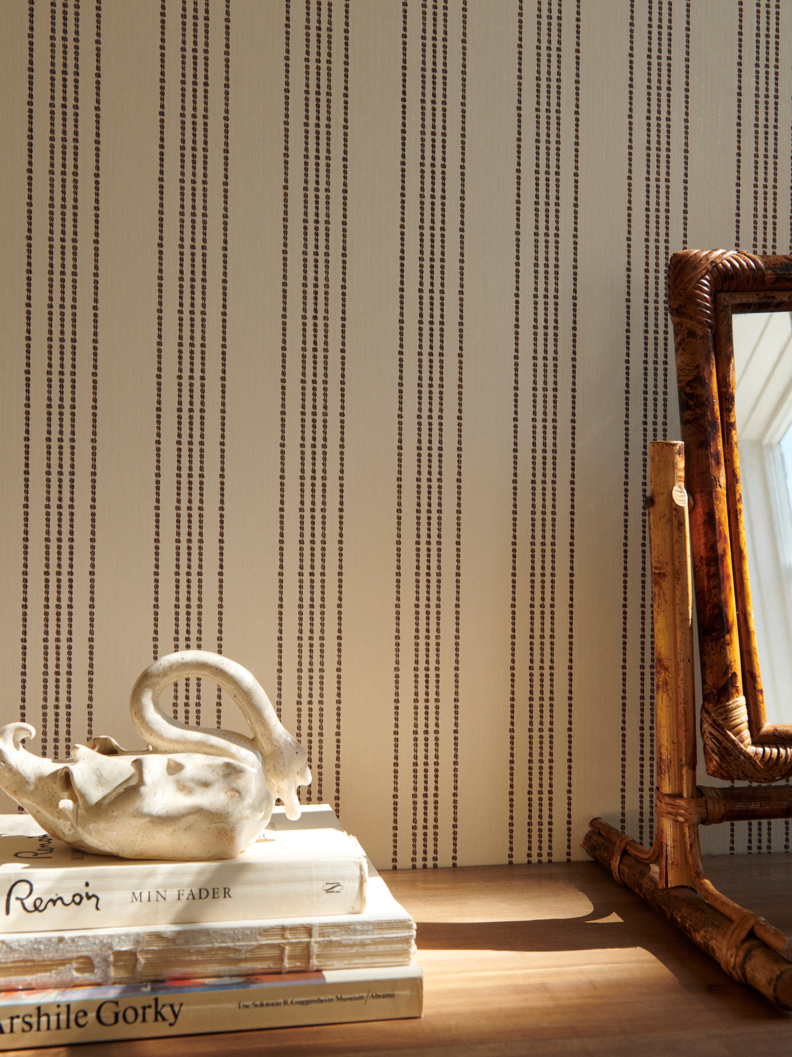 Vera's Stripe wallpaper is graced with printed dotted lines reminiscent of delicately strung natural pearls. The wallpaper effortlessly marries the organic with the historical and provides a graceful style with a stylish nod to superb craftsmanship.
